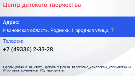Центр детского творчества по адресу Ивановская область, Родники, Народная улица, 7 в дальнейшем Организация, размещена в следующих категориях: