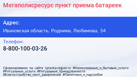 Мегаполисресурс, пункт приема батареек по адресу Ивановская область, Родники, Любимова, 54 в дальнейшем Организация, размещена в следующих категориях: