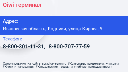 Qiwi, терминал по адресу Ивановская область, Родники, улица Кирова, 9 в дальнейшем Организация, размещена в следующих категориях: