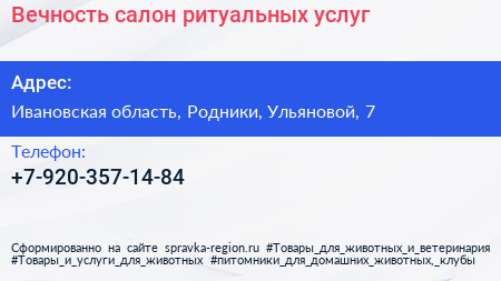 Вечность, салон ритуальных услуг по адресу Ивановская область, Родники, Ульяновой, 7 в дальнейшем Организация, размещена в следующих категориях: