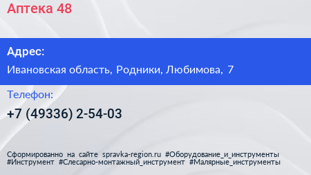 Аптека №48 по адресу Ивановская область, Родники, Любимова, 7 в дальнейшем Организация, размещена в следующих категориях: