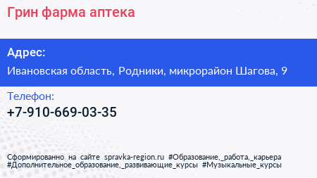 Грин фарма, аптека по адресу Ивановская область, Родники, микрорайон Шагова, 9 в дальнейшем Организация, размещена в следующих категориях: