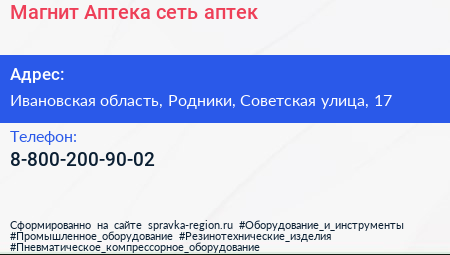 Магнит Аптека, сеть аптек по адресу Ивановская область, Родники, Советская улица, 17 в дальнейшем Организация, размещена в следующих категориях: