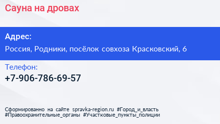 Сауна на дровах по адресу 6 с1, Посёлок Совхоза Красковский, посёлок совхоза "Красковский", Раменский городской округ, Московская область, Центральный федеральный округ, 140142, Россия в дальнейшем Организация, размещена в следующих категориях: