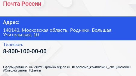 Почта России по адресу 140143, Московская область, Родники, Большая Учительская, 10 в дальнейшем Организация, размещена в следующих категориях: