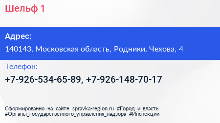 Шельф-1 по адресу 140143, Московская область, Родники, Чехова, 4 в дальнейшем Организация, размещена в следующих категориях: