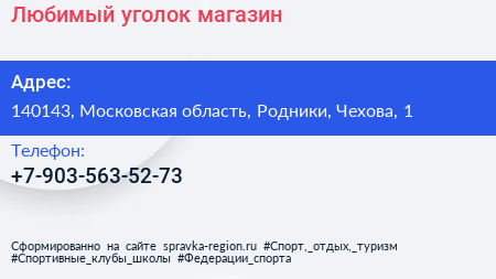 Любимый уголок, магазин по адресу 140143, Московская область, Родники, Чехова, 1 в дальнейшем Организация, размещена в следующих категориях: