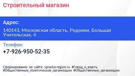 Строительный магазин по адресу 140143, Московская область, Родники, Большая Учительская, 4 в дальнейшем Организация, размещена в следующих категориях: