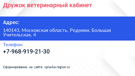 Дружок, ветеринарный кабинет по адресу 140143, Московская область, Родники, Большая Учительская, 4 в дальнейшем Организация, размещена в следующих категориях: