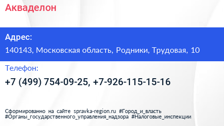 Акваделон по адресу 140143, Московская область, Родники, Трудовая, 10 в дальнейшем Организация, размещена в следующих категориях: