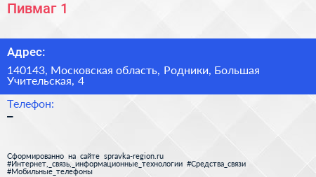 Пивмаг №1 по адресу 140143, Московская область, Родники, Большая Учительская, 4 в дальнейшем Организация, размещена в следующих категориях: