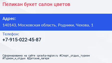Пеликан-букет, салон цветов по адресу 140143, Московская область, Родники, Чехова, 1 в дальнейшем Организация, размещена в следующих категориях: