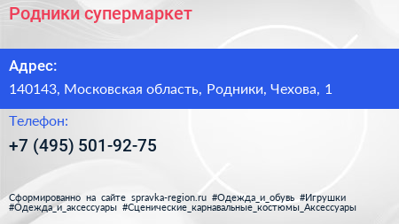 Родники, супермаркет по адресу 140143, Московская область, Родники, Чехова, 1 в дальнейшем Организация, размещена в следующих категориях: