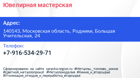Ювелирная мастерская по адресу 140143, Московская область, Родники, Большая Учительская, 24 в дальнейшем Организация, размещена в следующих категориях: