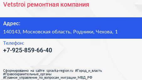 Vetstroi, ремонтная компания по адресу 140143, Московская область, Родники, Чехова, 1 в дальнейшем Организация, размещена в следующих категориях: