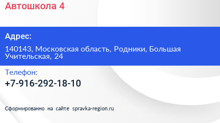 Автошкола №4 по адресу 140143, Московская область, Родники, Большая Учительская, 24 в дальнейшем Организация, размещена в следующих категориях: