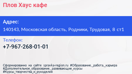 Плов Хаус, кафе по адресу 140143, Московская область, Родники, Трудовая, 8 ст1 в дальнейшем Организация, размещена в следующих категориях: