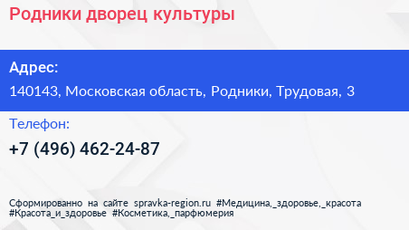 Родники, дворец культуры по адресу 140143, Московская область, Родники, Трудовая, 3 в дальнейшем Организация, размещена в следующих категориях: