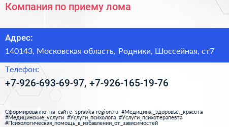Компания по приему лома по адресу 140143, Московская область, Родники, Шоссейная, ст7 в дальнейшем Организация, размещена в следующих категориях: