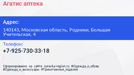 Агатис, аптека по адресу 140143, Московская область, Родники, Большая Учительская, 4 в дальнейшем Организация, размещена в следующих категориях: