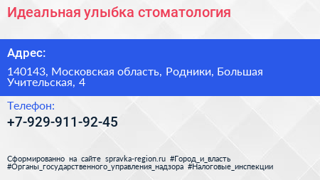 Идеальная улыбка, стоматология по адресу 140143, Московская область, Родники, Большая Учительская, 4 в дальнейшем Организация, размещена в следующих категориях: