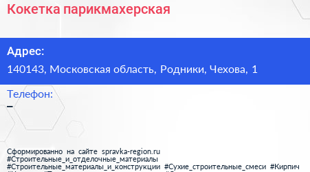 Кокетка, парикмахерская по адресу 140143, Московская область, Родники, Чехова, 1 в дальнейшем Организация, размещена в следующих категориях: