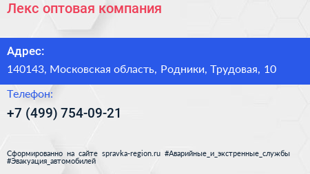 Лекс, оптовая компания по адресу 140143, Московская область, Родники, Трудовая, 10 в дальнейшем Организация, размещена в следующих категориях:
