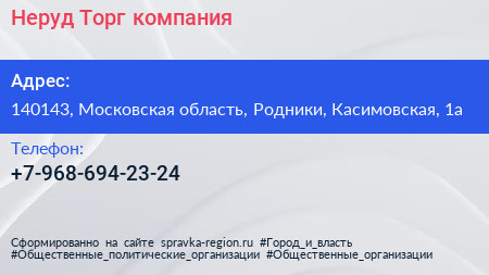 Неруд Торг, компания по адресу 140143, Московская область, Родники, Касимовская, 1а в дальнейшем Организация, размещена в следующих категориях: