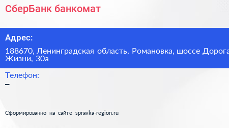 СберБанк, банкомат по адресу 188670, Ленинградская область, Романовка, шоссе Дорога Жизни, 30а в дальнейшем Организация, размещена в следующих категориях: