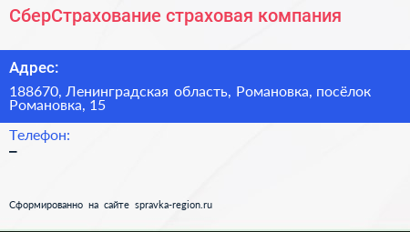 СберСтрахование, страховая компания по адресу 188670, Ленинградская область, Романовка, посёлок Романовка, 15 в дальнейшем Организация, размещена в следующих категориях: