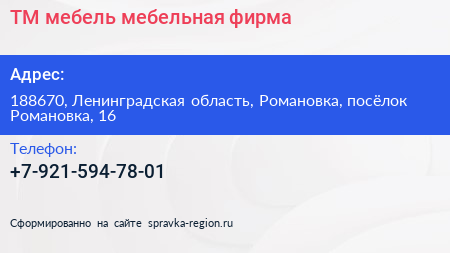 ТМ мебель, мебельная фирма по адресу 188670, Ленинградская область, Романовка, посёлок Романовка, 16 в дальнейшем Организация, размещена в следующих категориях: