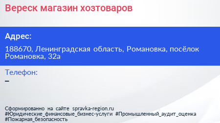 Вереск, магазин хозтоваров по адресу 188670, Ленинградская область, Романовка, посёлок Романовка, 32а в дальнейшем Организация, размещена в следующих категориях: