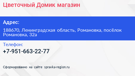 Цветочный Домик, магазин по адресу 188670, Ленинградская область, Романовка, посёлок Романовка, 32а в дальнейшем Организация, размещена в следующих категориях: