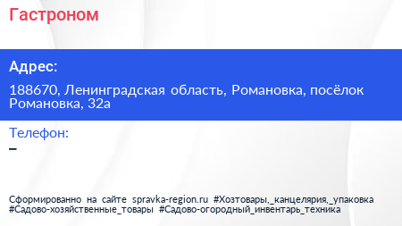Гастроном по адресу 188670, Ленинградская область, Романовка, посёлок Романовка, 32а в дальнейшем Организация, размещена в следующих категориях: