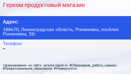Герком, продуктовый магазин по адресу 188670, Ленинградская область, Романовка, посёлок Романовка, 32г в дальнейшем Организация, размещена в следующих категориях: