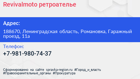 Revivalmoto, ретроателье по адресу 188670, Ленинградская область, Романовка, Гаражный проезд, 11а в дальнейшем Организация, размещена в следующих категориях: