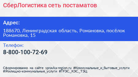 СберЛогистика, сеть постаматов по адресу 188670, Ленинградская область, Романовка, посёлок Романовка, 15 в дальнейшем Организация, размещена в следующих категориях: