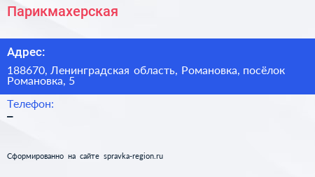 Парикмахерская по адресу 188670, Ленинградская область, Романовка, посёлок Романовка, 5 в дальнейшем Организация, размещена в следующих категориях: