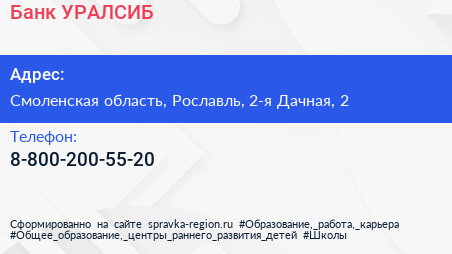 Банк УРАЛСИБ по адресу Смоленская область, Рославль, 2-я Дачная, 2 в дальнейшем Организация, размещена в следующих категориях: