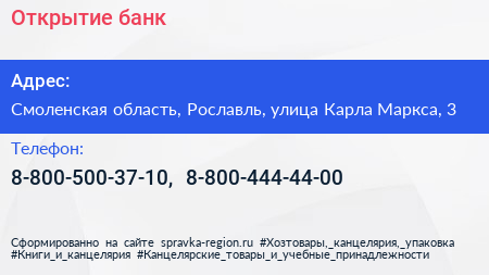 Открытие, банк по адресу Смоленская область, Рославль, улица Карла Маркса, 3 в дальнейшем Организация, размещена в следующих категориях: