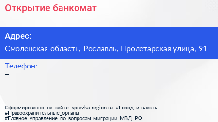 Открытие, банкомат по адресу Смоленская область, Рославль, Пролетарская улица, 91 в дальнейшем Организация, размещена в следующих категориях: