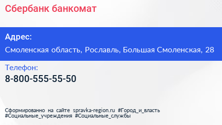 Сбербанк, банкомат по адресу Смоленская область, Рославль, Большая Смоленская, 28 в дальнейшем Организация, размещена в следующих категориях: