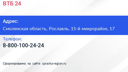 ВТБ 24 по адресу Смоленская область, Рославль, 15-й микрорайон, 17 в дальнейшем Организация, размещена в следующих категориях: