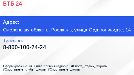 ВТБ 24 по адресу Смоленская область, Рославль, улица Орджоникидзе, 14 в дальнейшем Организация, размещена в следующих категориях: