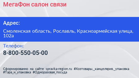 МегаФон, салон связи по адресу Смоленская область, Рославль, Красноармейская улица, 102а в дальнейшем Организация, размещена в следующих категориях: