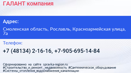 ГАЛАНТ, компания по адресу Смоленская область, Рославль, Красноармейская улица, 7а в дальнейшем Организация, размещена в следующих категориях: