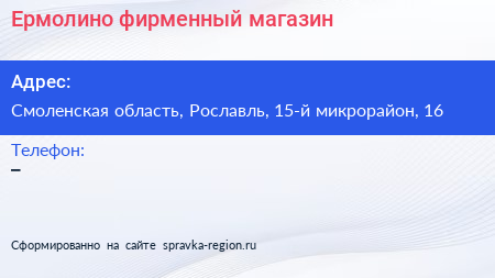 Ермолино, фирменный магазин по адресу Смоленская область, Рославль, 15-й микрорайон, 16 в дальнейшем Организация, размещена в следующих категориях: