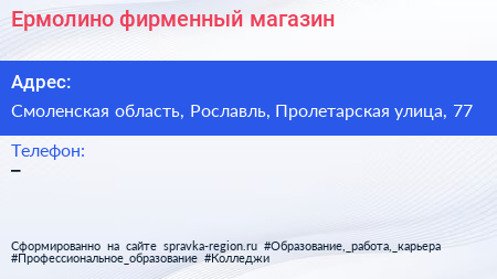Ермолино, фирменный магазин по адресу Смоленская область, Рославль, Пролетарская улица, 77 в дальнейшем Организация, размещена в следующих категориях:
