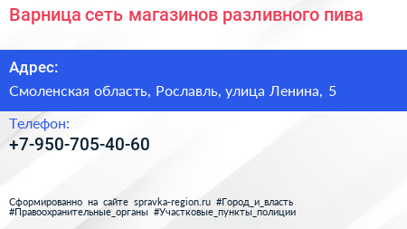 Варница, сеть магазинов разливного пива по адресу Смоленская область, Рославль, улица Ленина, 5 в дальнейшем Организация, размещена в следующих категориях:
