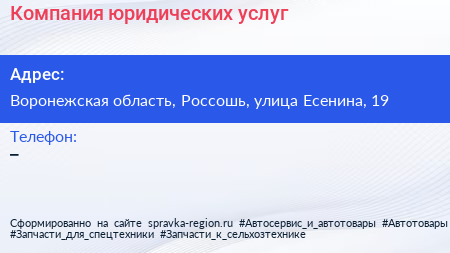 Компания юридических услуг по адресу Воронежская область, Россошь, улица Есенина, 19 в дальнейшем Организация, размещена в следующих категориях: